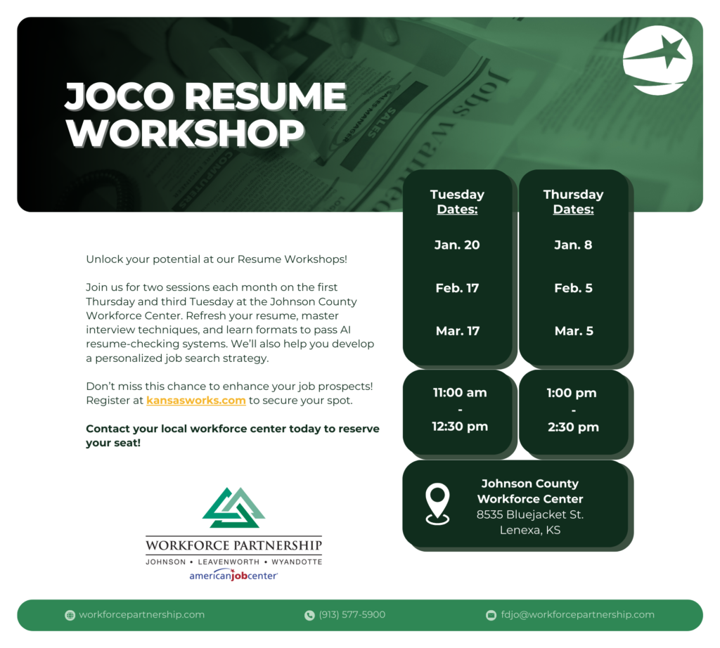 The Rapid Response packet includes detailed information about Workforce Partnership‘s career center and intensive services offered to individuals who have been laid off. The packet also includes detailed information from the KS Department of Labor on how to file for unemployment benefits on its new online platform, plus additional guidance on job transition planning.